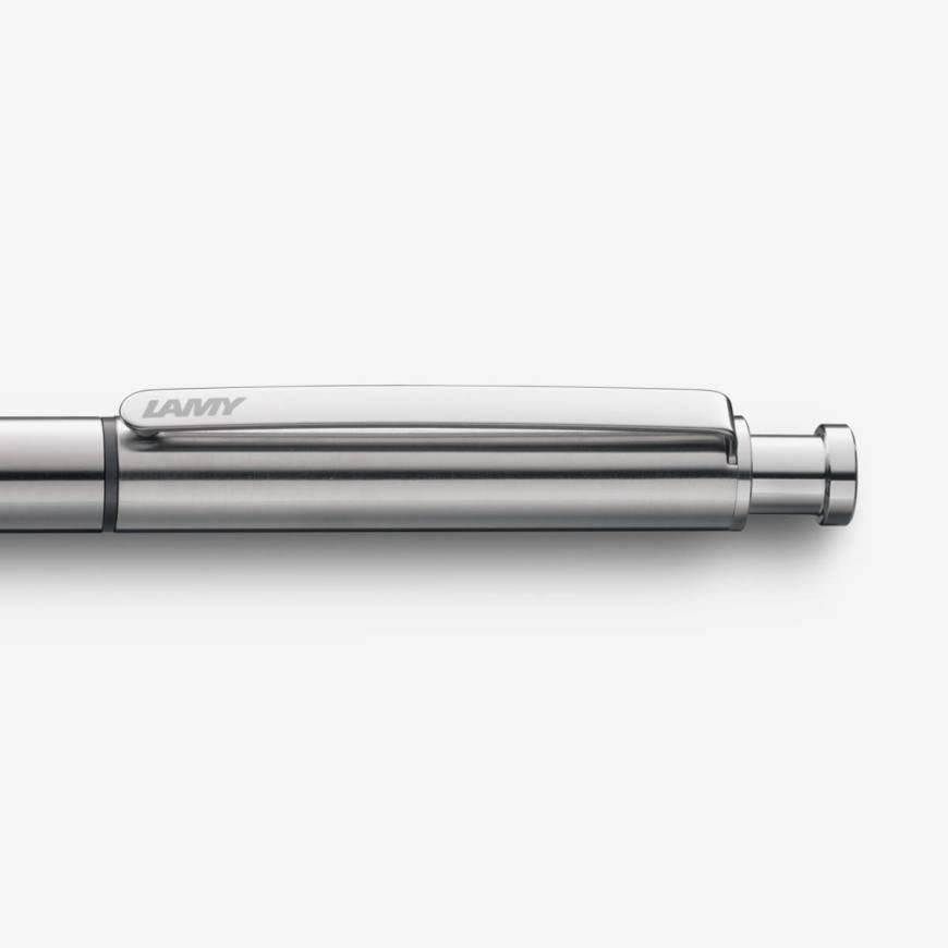 LAMY st presenta un diseño elegante con una forma cilíndrica excepcional y un clip de acero con acción resorte. Este bolígrafo multifunción viene 2 en 1: Bolígrafo color negro y portaminas de 0,5 mm. Tiene borrador incorporado.